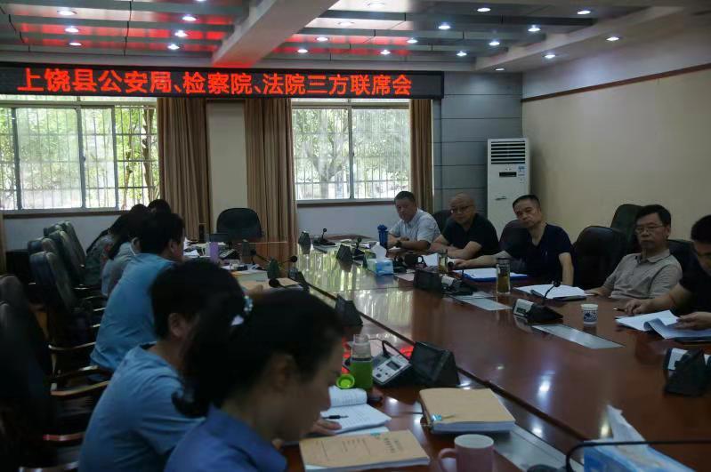 为深入推进扫黑除恶专项斗争工作的开展,夯实案件办理质量,提高办案质效,近日,上饶县人民检察院联合上饶县公安局、上饶县人民法院,在上饶县人民检察院召开了陈某某黑社会性质组织案件三家会商会。上饶县人民检察院检察长、陈某某黑社会性质组织案件主任检察官严毅主持会议,公安局杨成局长、法院李国武院长及其他办案干警、法官参加了会议。