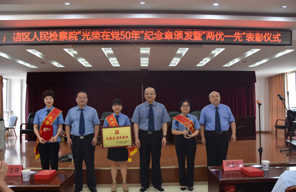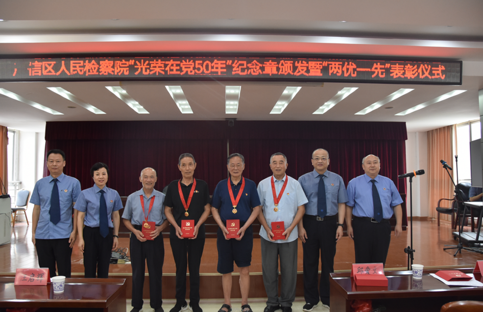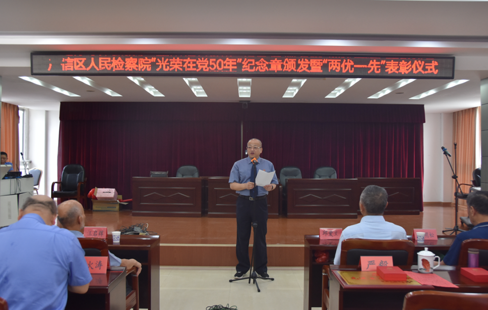 区检察院举行“光荣在党50年”纪念章颁发暨“两优一先”表彰仪式,会议宣读了“光荣在党50年”纪念章颁发对象名单和区检察院“两优一先”表彰通报。