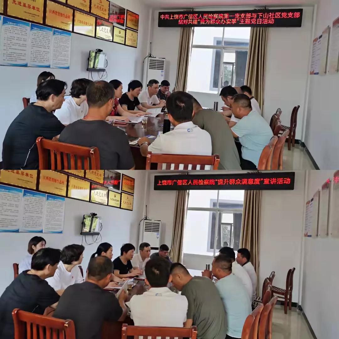 乐小敏同志对检察机关“四大检察”“十大业务”进行了介绍,对下山村的党建工作及创文工作予以了肯定,她要求双方党支部通过结对帮扶共建活动,进一步加深了解,密切关系,从而带动双方的各项工作,促进“以党建带业务、以业务促党建”取得新突破。姚智勇同志对广信区人民检察院提升群众满意度工作进行了宣讲。双方支部还就支部人员、党建工作、创文工作开展情况等进行了交流。