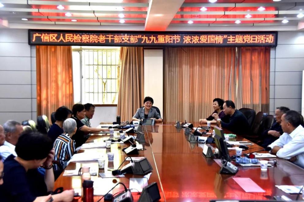 2021年10月14日上午,广信区人民检察院新任检察长乐小敏及院领导和退休老干部一起欢度九九重阳节,向老检察官们表示节日的问候和美好的祝愿,并与老干部亲切交谈,关心关爱老干部的生活、身体状况。乐检察长真诚希望各位老干部继续发挥热量,充分利用自身优势,积极建言献策,发挥示范传承作用,一如既往讲好党的故事,传播广信检察好声音,保持老党员对党忠诚的政治品德,发扬光荣传统,继续为检察事业作出贡献。