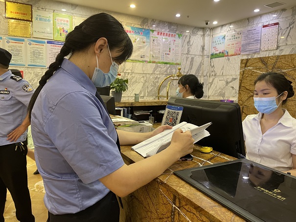 近期,本院在办理涉未成年人刑事案件时发现,宾馆、酒店等场所是未成年人性犯罪的高发地,在规范未成年人入住等方面,存在多处违规的情况,已成为性侵害未成年人以及未成年人犯罪的“温床”。为切实落实酒店旅馆业建立健全未成年人入住保护机制,从源头预防和治理性侵未成年人违法犯罪,净化未成年人的成长环境。2022年7月22日晚,本院未检团队联合广信区公安局治安大队、旭日派出所对辖区内酒店旅馆业进行了专项检查。