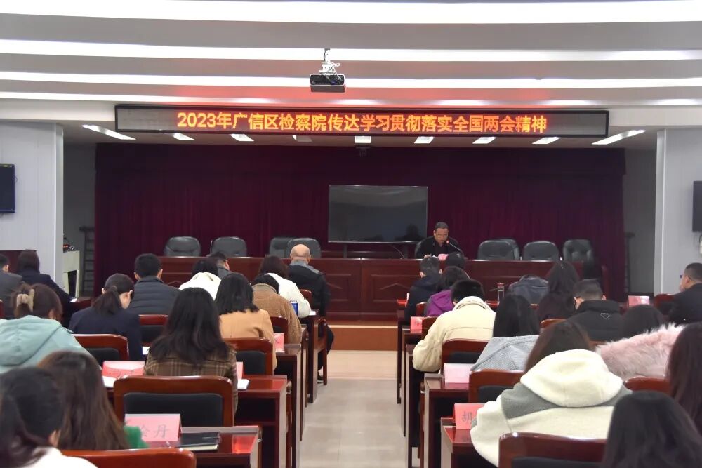3月20日上午,上饶市广信区人民检察院召开全院干警大会,专题传达学习全国两会精神。院党组成员、政治部主任蔡中华主持会议,全院干警参加。 这次全国两会是党的二十大后召开的一次重要会议,对全面贯彻落实党的二十大精神,实现全面建设社会主义现代化国家顺利开局起步,具有十分重要的意义。全院干警要统一思想,凝聚共识,深入学习领会两会精神实质,聚焦两会目标任务。要将全国两会精神与全国、全省、全市检察长会议精神结合起来,融会贯通学、联系实际学、全面系统学,提振信心、提振精神,重实效、强实干、抓落实,奋力推进检察工作“高质量走前列”发展。 全院干警要坚持思想引领,在深刻领会全国两会精神上“入脑入心”。要将认真学习领会党的二十届二中全会、全国两会精神作为当前和今后一个时期的重大政治任务,要切实把习近平总书记最新指示精神及最高检最新工作要求落实到检察工作各方面。要聚焦主责主业,在高质量发展上“持续用力”。深刻领悟案件质量主要评价指标的导向作用,紧盯业务目标。要深化创新能动履职,积极主动服务大局,助力优化法治化营商环境,持续做实司法救助工作,以检察工作现代化服务保障经济社会高质量发展。要深化运用“三查融合”办案机制,着力以个案办理推动类案监督,切实提升检察贡献度,加快数据建模工作进度,切实以数字赋能监督,以监督促区域社会治理。要坚决从严治检,在全面从严管党治检上“从严从实”。全面落实“一岗双责”责任,转变工作作风、提升法律监督能力,建立健全清单化+闭环式管理工作机制,确保每一项工作任务清、底数清、措施清,要抓住队伍管理上的堵点和漏点,一项一项的破解,严实干警的日常教育管理。要继续深化检务公开,加强新时代检察宣传工作,要认真落实检察公开听证制度,让案件办理更有温度、更有公信。持续抓好品牌建设工程,积极打造更多更优检察品牌。