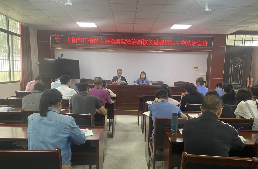 为进一步增强青少年法治意识和自我保护能力,切实预防和减少青少年犯罪,保护未成年人合法权益。5月25日,上饶市广信区人民检察院检委会专职委员、枫岭头中学法治副校长程慧淑带领检察干警们走进枫岭头中学,开展“送法进校园”系列活动。