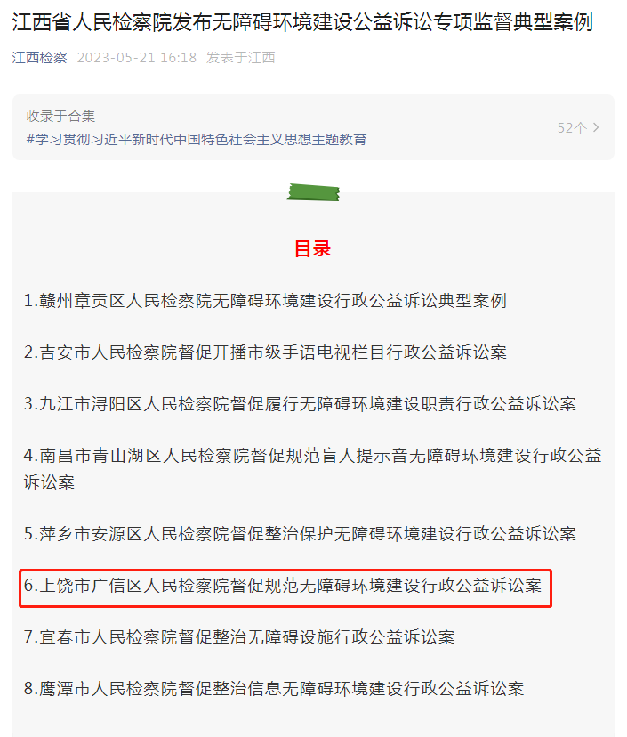 5月21日是第三十三个全国助残日,为切实保障残疾人等特殊群体平等参与社会生活的基本权利,江西省人民检察院发布无障碍环境建设公益诉讼专项监督典型案例。广信区检察院办理的督促规范无障碍环境建设行政公益诉讼案成功入选。