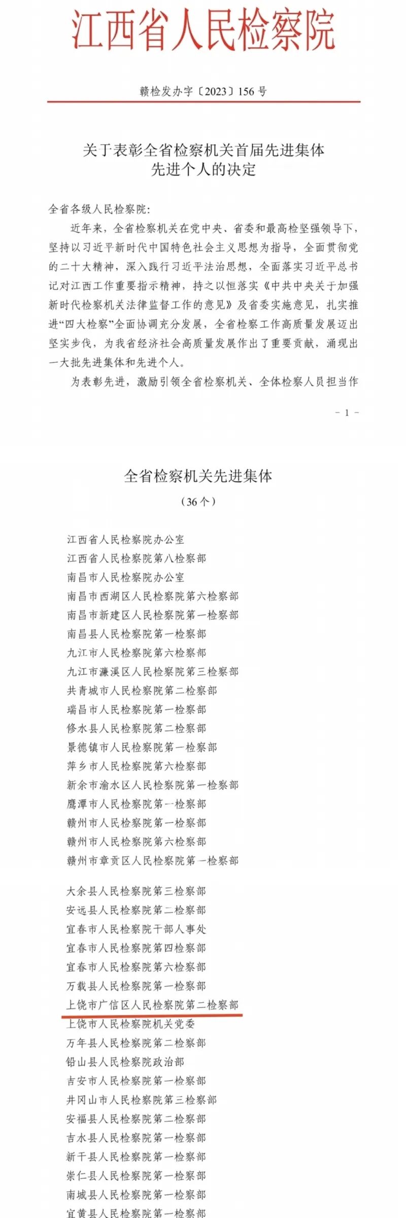 近日,江西省人民检察院下发《关于表彰全省检察机关首届先进集体先进个人的决定》,上饶市广信区人民检察院第二检察部获评“全省检察机关先进集体”。