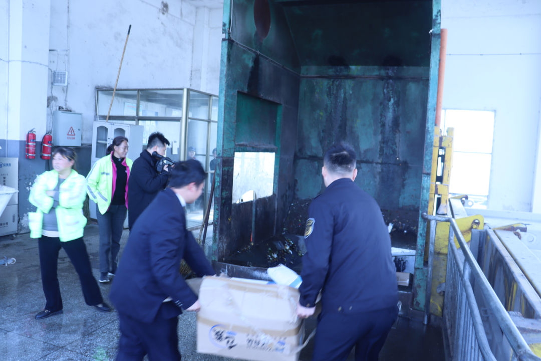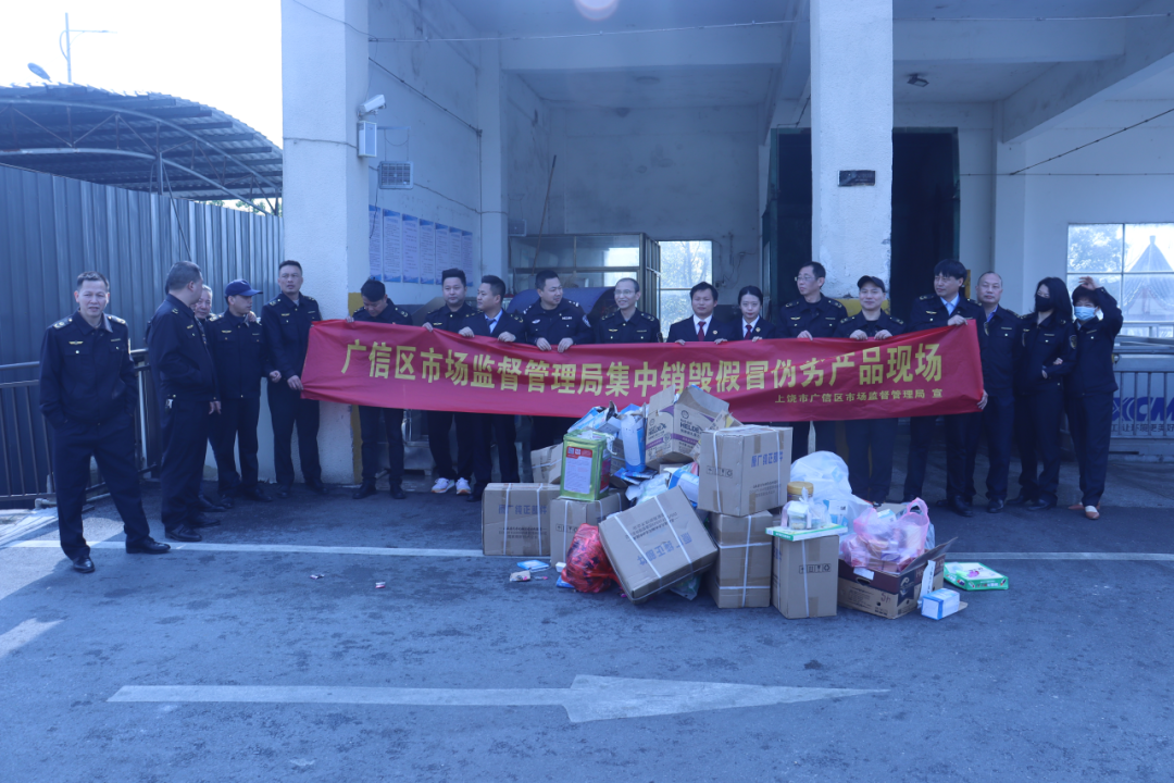 在广信区樱花公园垃圾中转站,广信区人民检察院检察干警和区市场监督管理局执法人员联合开展集中销毁假冒伪劣产品活动。针对前期在各类专项行动中查处的一批假冒伪劣产品进行了无害化集中销毁,主要包括饮料、调味品、酒类、休闲食品等问题食品和问题药品、化妆品等人民群众日常生产生活所必需的消费用品。