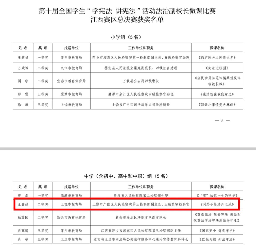 近日,江西省教育厅组织下发《关于公布第十届全国学生“学宪法讲宪法”活动中小学法治课教师与法治副校长微课比赛江西赛区总决赛获奖名单的通知》文件,其中,广信检察一干警王睿婧同志的作品《网络不是法外之地》荣获法治副校长组二等奖!