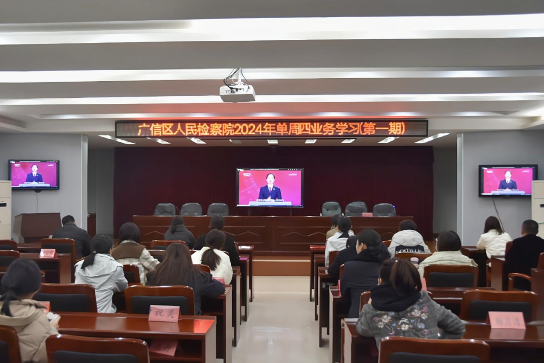 2024 年 3 月 7 日晚,广信区院开始了第一期业务学习,组织集中观看第八届全国检察机关十佳公诉人暨优秀公诉人业务竞赛第二期《斧头下的争议》,全院检察官和检察官助理参加。