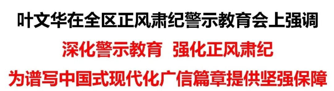 6月11日,全区正风肃纪警示教育会召开。区委书记叶文华主持并讲话。他强调,要深入学习贯彻习近平总书记关于加强党的作风建设的重要论述和中央八项规定及其实施细则精神,全面落实党中央关于学习教育的决策部署和省委、市委工作要求,深化以案说德、以案说纪、以案说法、以案说责,坚持真管真严、敢管敢严、长管长严,锲而不舍落实中央八项规定及其实施细则精神,为奋力谱写中国式现代化广信篇章提供坚实作风保障。