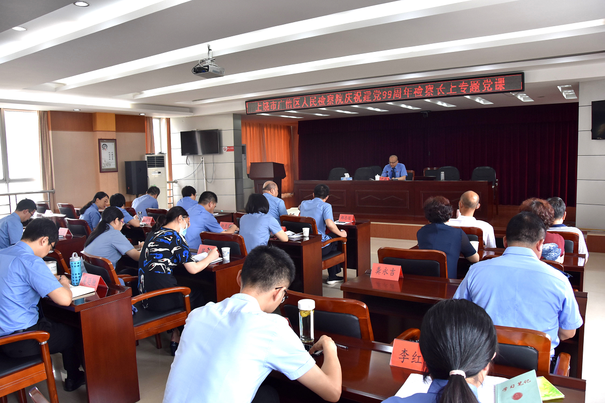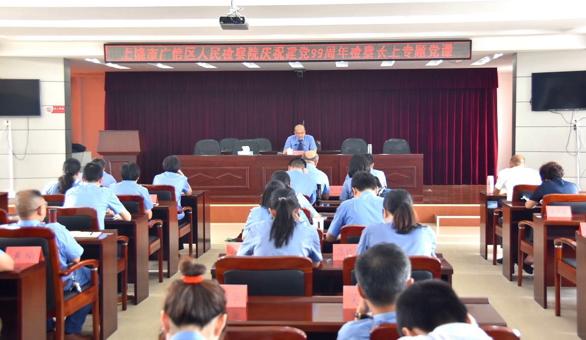 为常态化深入学习贯彻党的十九大以来各次全会精神,持续做好“不忘初心、牢记使命”主题教育的学习工作,进一步凝聚共识、激发检察干警干事创业热情,用习近平新时代中国特色社会主义思想武装头脑、指导实践、推动工作,以优异的成绩庆祝建党99周年。7月1日,广信区检察院党组书记、检察长严毅为全院干警上了一堂既生动又有内涵和深度的党课。全体党员干警到会听课。
