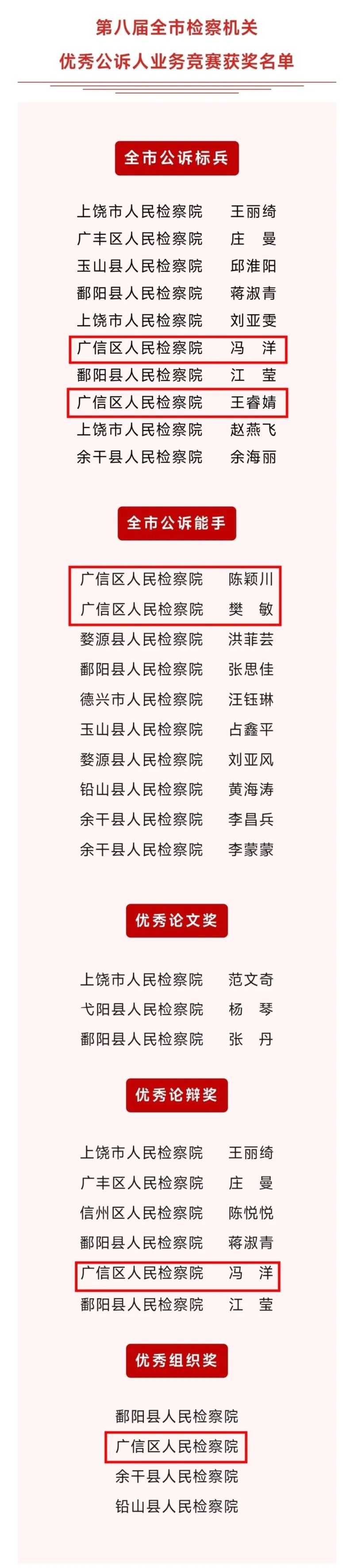 近日,上饶检察机关第八届优秀公诉人业务竞赛举行,我院干警王睿婧、冯洋荣获“全市公诉标兵”称号;陈颖川、樊敏荣获“全市公诉能手”称号;冯洋荣获“优秀论辩奖”;我院荣获“优秀组织奖”。