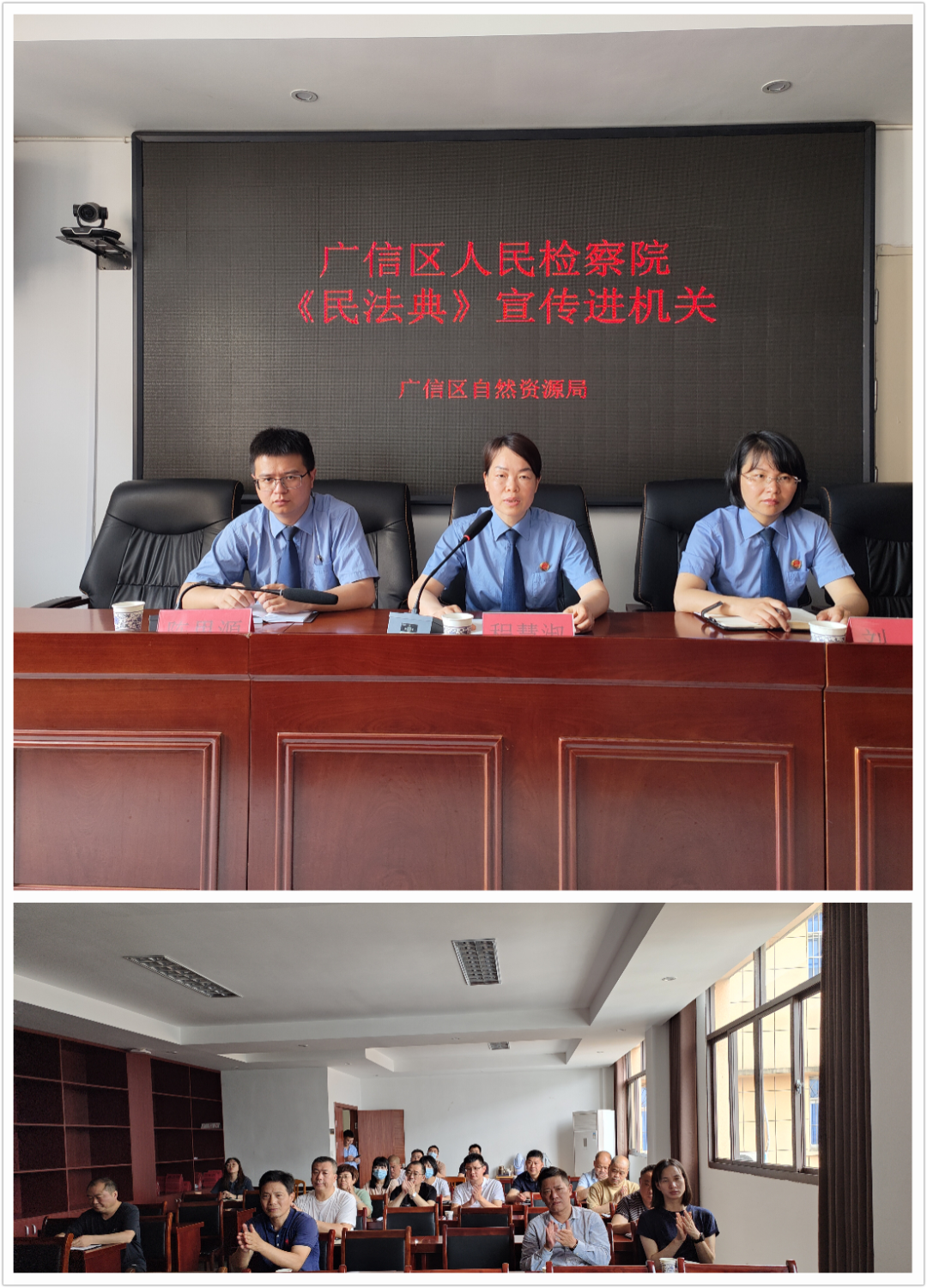 5月26日,第二检察部干警到广信区自然资源局开展民法典宣传活动,从民法典的重大意义、主要内容以及身边的民法典知识等,结合高空抛物、见义勇为、高铁霸座等热门话题进行以案释法,上了一堂民法典专题普法讲座。讲座结束后,就大家在工作和生活中遇到的法律困惑进行了现场解答,受到了一致好评,“典”燃了机关干部职工的学法热情,大家纷纷表示要进一步加强对民法典的学习,养成自觉守法、遇事找法、解决问题靠法的意识和习惯。